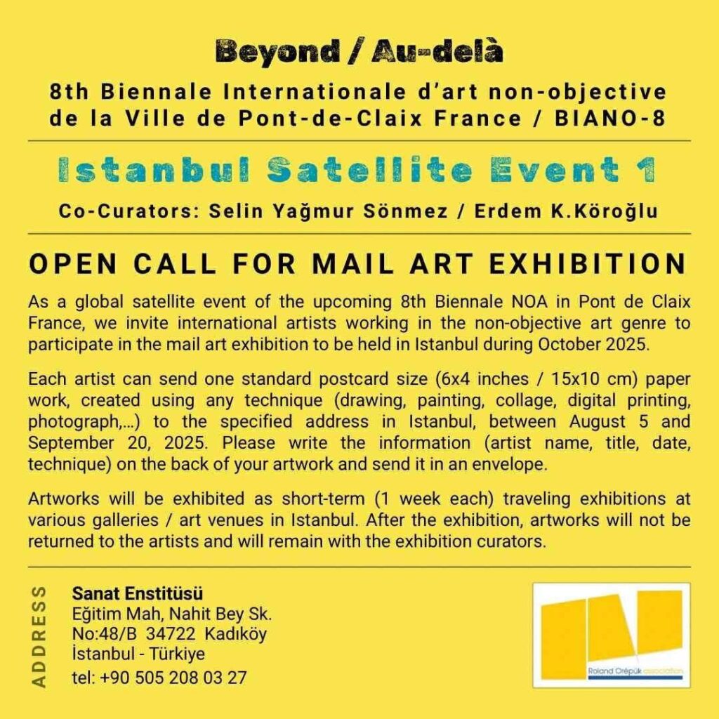 Categories Exhibitions 8th Biennale of NOA: Satellite Event @ Sanat Ensti̇tüsü – October 2025 Post author By curator Post date September 10, 2025 Participation in the Satellite Event which is a Mail Art Excibition. For more information please visit ← ‘Séquence de l’été 2025’ – Group Exhibition @ Le Manoir – July 12th to September 13th 2025 → 8th Biennale of NOA: Satellite Exhibition @ Discursive Geometry – 13/09/205 to 11/10/2025